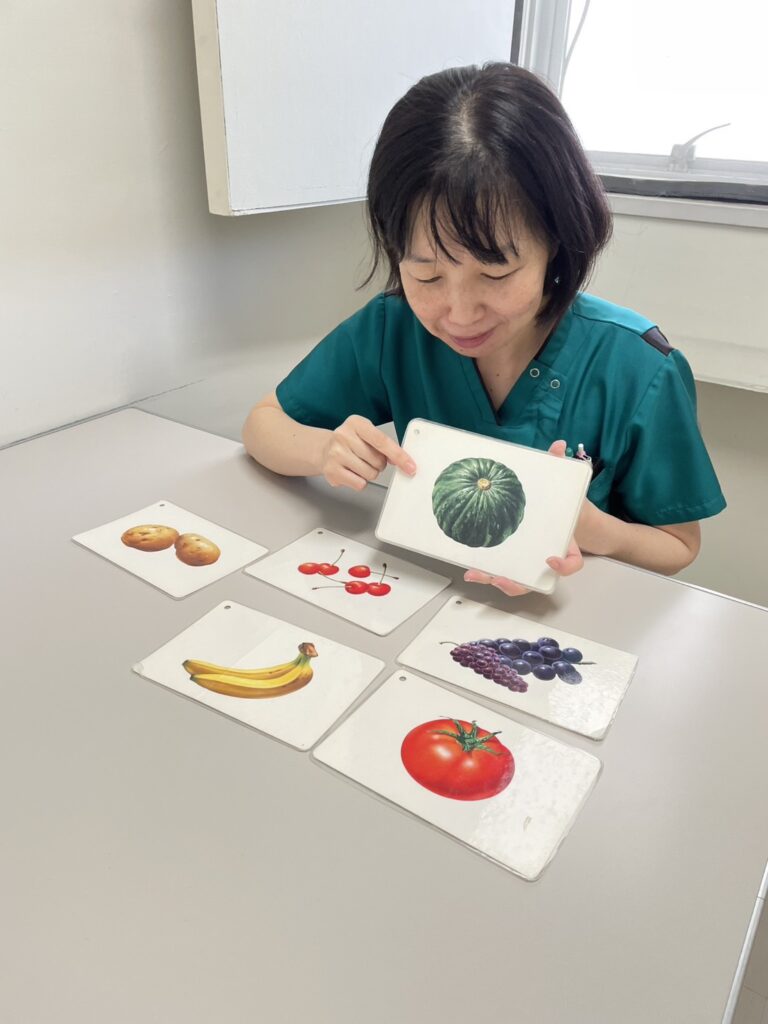 表情や身振り、文字を書いたり、指をさして伝えたり、人それぞれ障害の程度も違います。それらを様々な側面から評価し、その方に合ったコミュニケーション手段を一緒に考え日常で使えるように練習していきます。もちろん言語機能そのものに対してのアプローチも行っていきます。